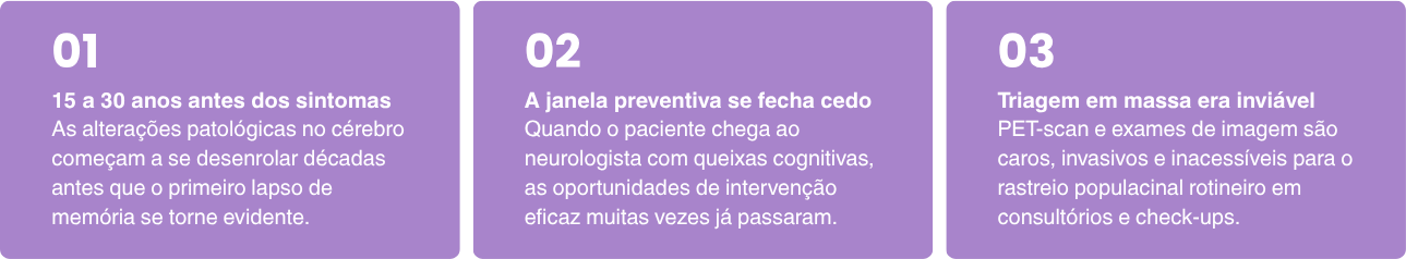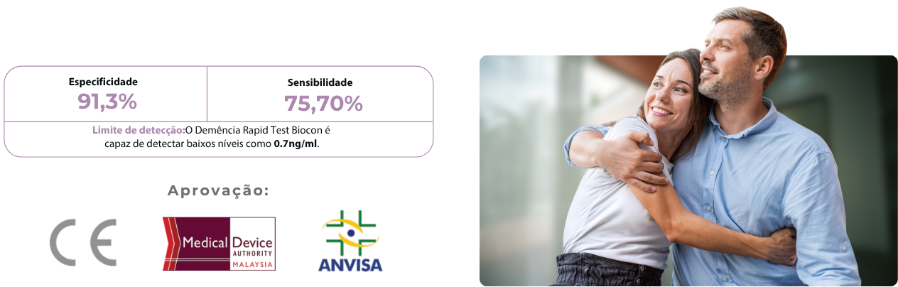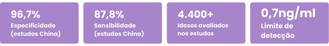 Nos estudos realizados na China (com mais de 4.400 idosos), o teste apresentou especificidade de 96,7% e sensibilidade de 87,8%. Nos dados de aprovação (possivelmente referentes a outra coorte ou critério regulatório), são reportados 91,3% de especificidade e 75,7% de sensibilidade. A tecnologia foi publicada no Journal of Alzheimer’s Disease em 2025, validada também pelo estudo AIBL na Austrália, e conta com aprovação CE, Medical Device Authority (Malásia) e ANVISA.
